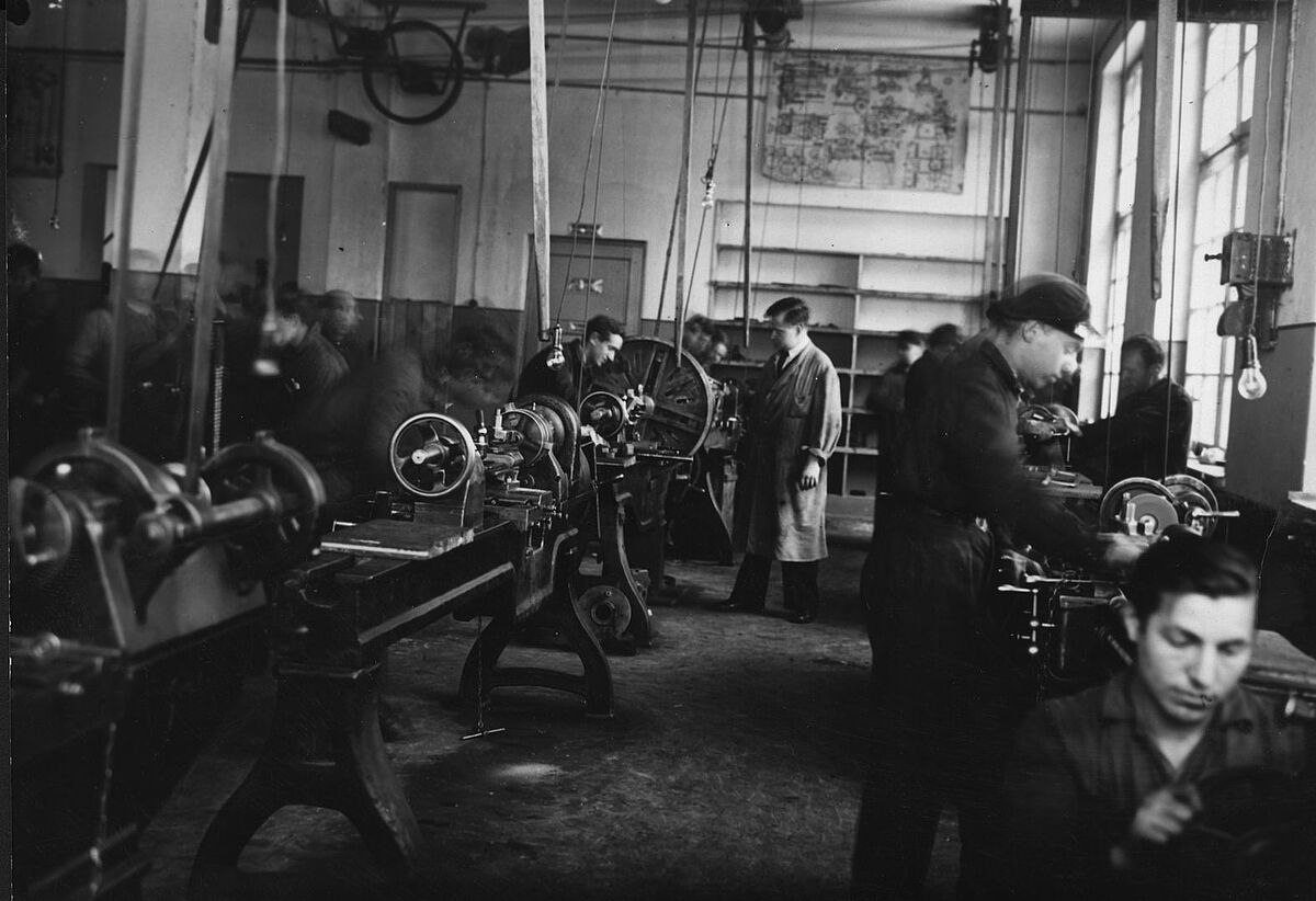 Students in a workshop at the Kaunas [Kovno] technical school, Lithuania, 1937.