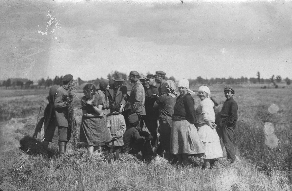 A group in Pervomaiskii settlement, Belarus, 1920s-1930s. Group of people in a field. Archive Ref. psa0245