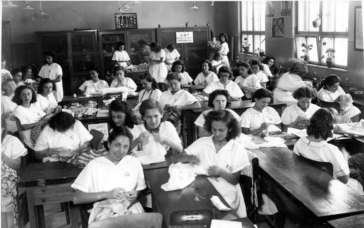 Sewing class for young women at an ORT Budapest workshop, Hungary, 1947.