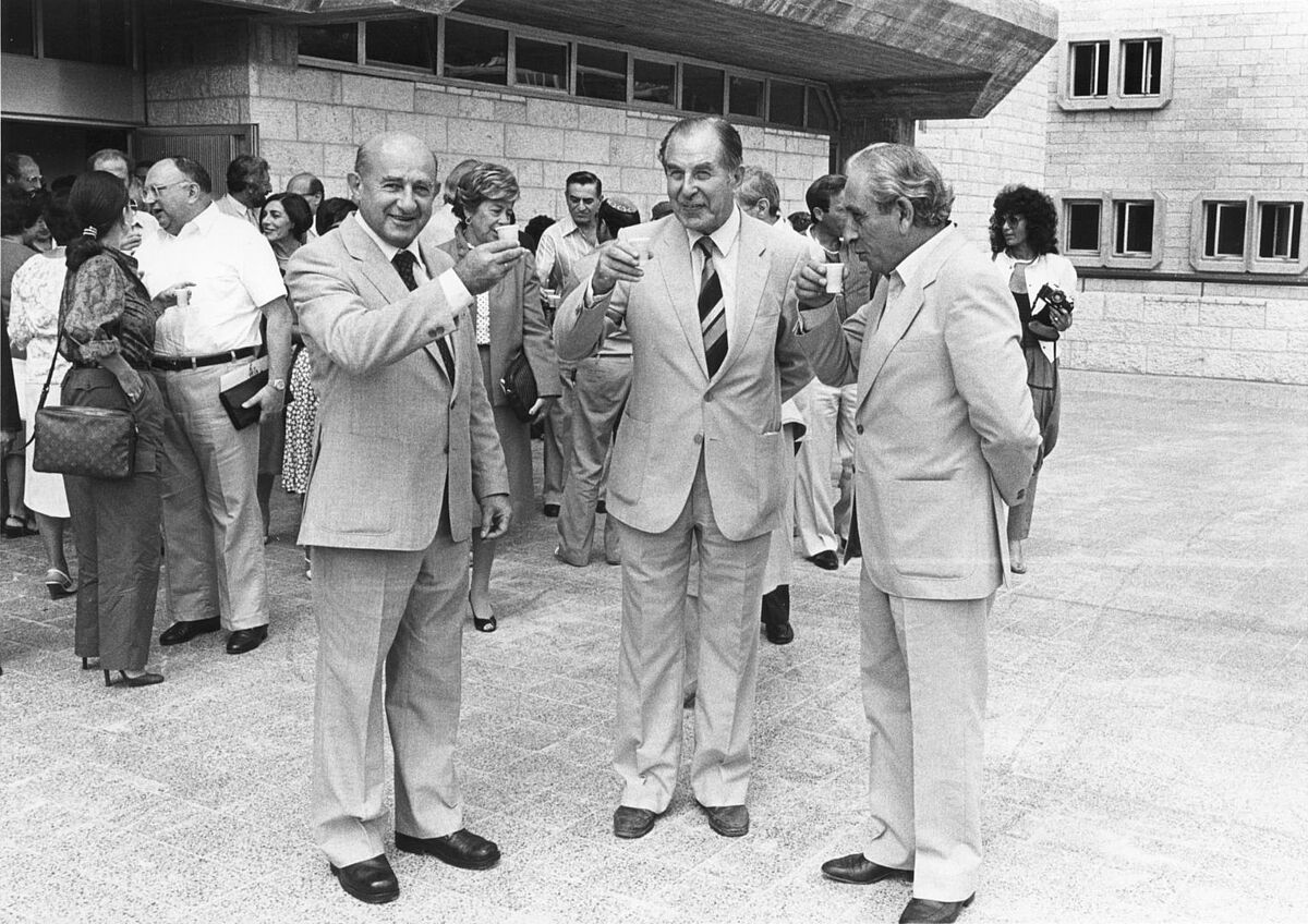 Dedication of phase II of ORT College of Engineering in Jerusalem, 13 September 1982. Joseph Harmatz, Chaim Herzog and Uzi Steinberg. Archive Ref. p16a014