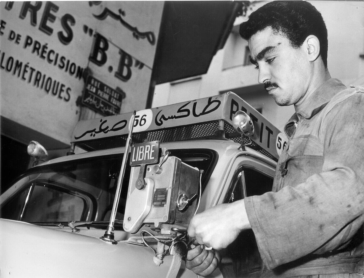 An ORT Morocco apprentice repairs a taxi cab, 1950s.