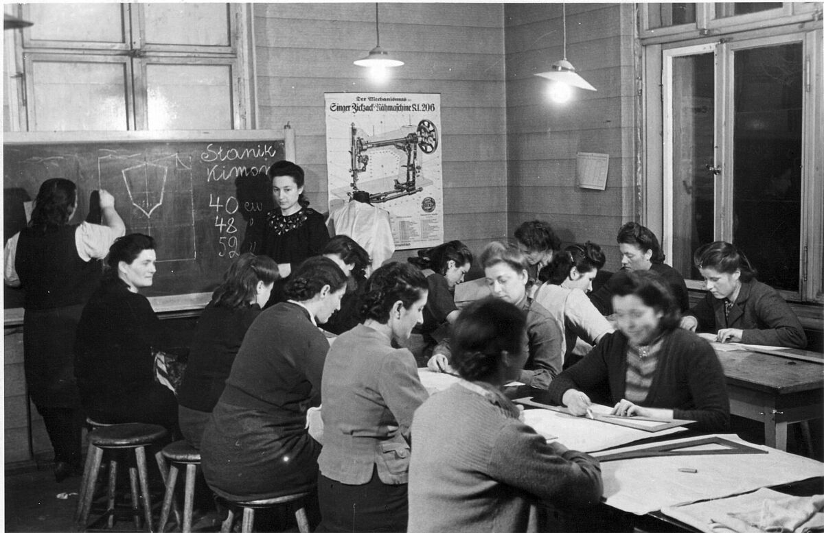 Students at work at the ORT school of sewing, Dzierzoniow, Poland, c. 1948. Archive Ref. p05a077
