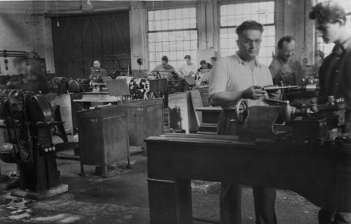 Students in the turning workshop at ORT Legnica, Poland, 1958.