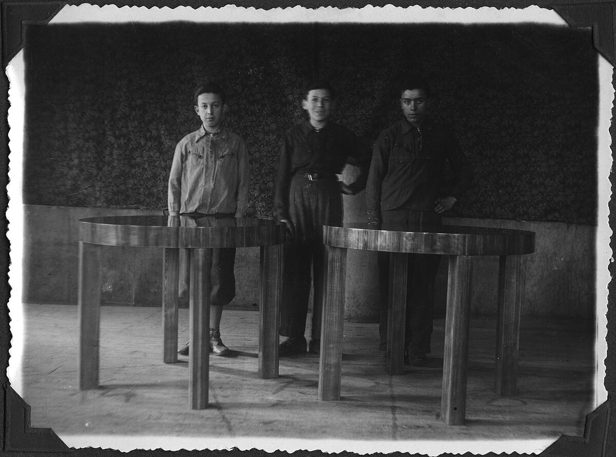 School exhibition in ORT Sarny [Sarni], Poland [now Ukraine], 1937. Students with furniture pieces they made. Archive Ref. psa1789_32_top-right